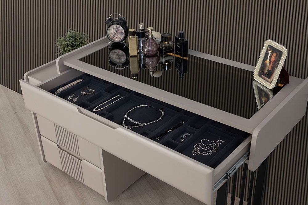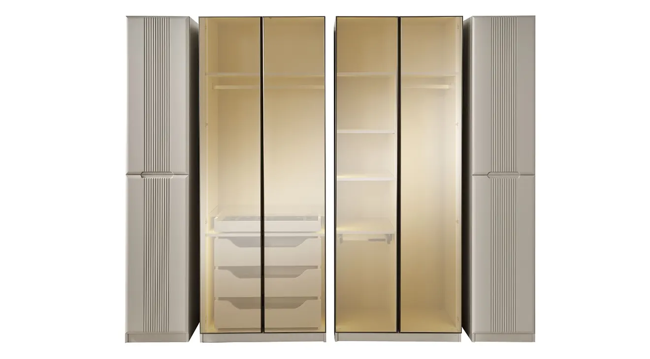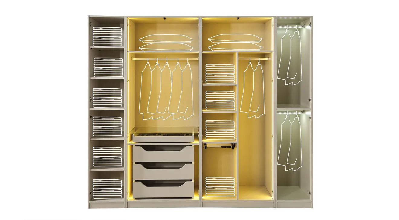 | 6 Kapaklı Gardırop | 1 Adet Çekmeceli Modül, 1 adet Raflı Askılıklı Modül, 1 adet Tekli Çift Askılıklı Modül ve 1 Adet tekli Raflı Modülden Oluşmaktadır. |